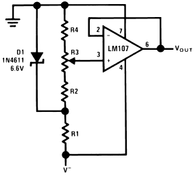 High precision extended temperature applications of the circuit of Figures 1, 2 require that the range of adjustment of VOUT be restricted. When this is done, R1 may be chosen to provide optimum zener current for minimum zener T.C. Since IZ is not a function of V+, reference T.C. will be independent of V+.